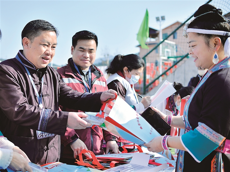 改進文風(fēng),要將文件精神轉(zhuǎn)化為群眾看得懂、用得上的“明白紙”,推動政策在基層落地生根。圖為廣西壯族自治區(qū)三江侗族自治縣組織黨員干部到良口鄉(xiāng)良口村開展政策宣傳進村寨活動。工作人員以侗語、苗語等多種語言,通俗易懂地為群眾宣講惠農(nóng)惠民政策,提高少數(shù)民族群眾對政策的知曉率。圖片來源:視覺中國