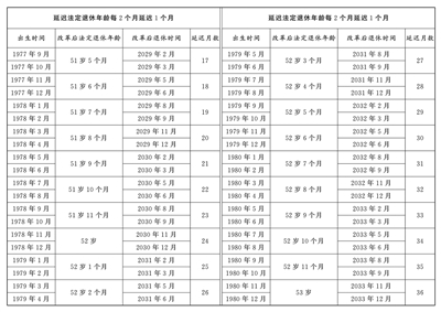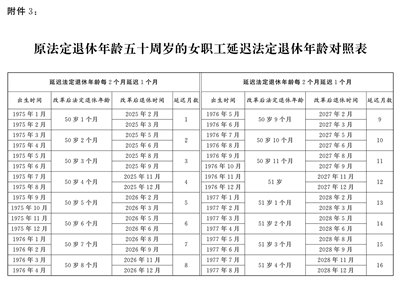 3.原法定退休年齡五十周歲的女職工延遲法定退休年齡對照表