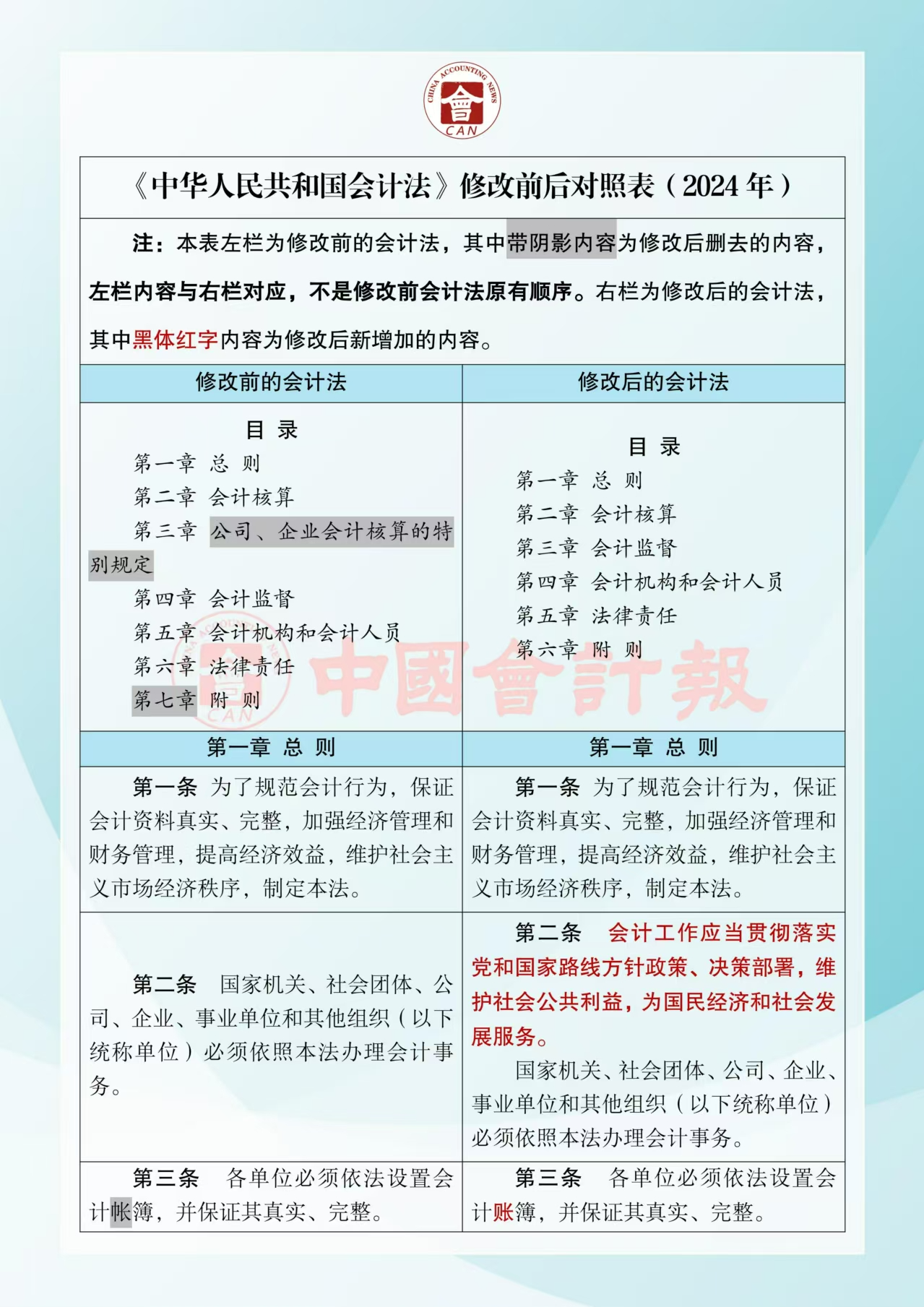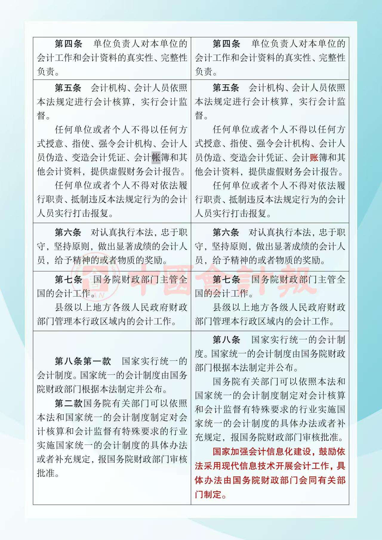 《中華人民共和國會(huì)計(jì)法》修改前后對照表(2024年)