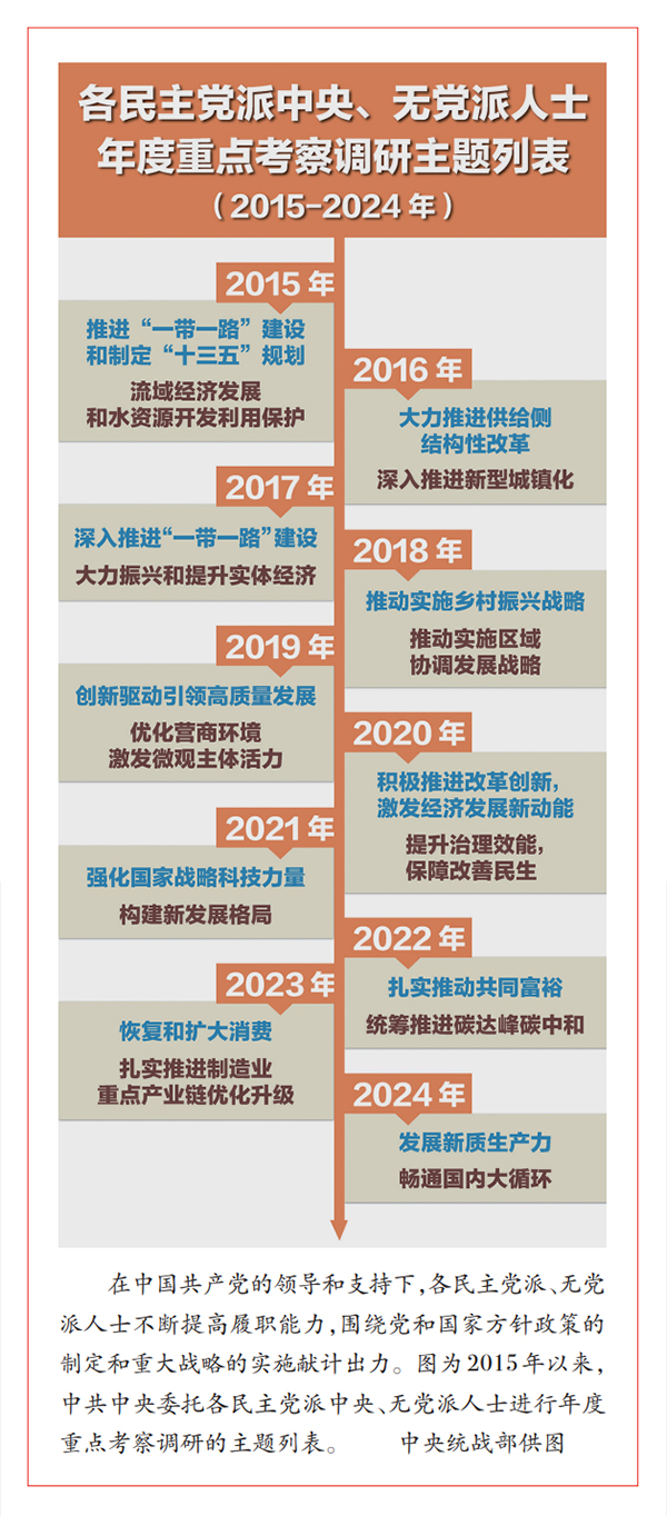 二是支持民主黨派、無(wú)黨派人士履職盡責(zé),為推進(jìn)中國(guó)式現(xiàn)代化凝心聚力。要提高政黨協(xié)商質(zhì)量,各級(jí)黨委特別是領(lǐng)導(dǎo)干部帶頭增強(qiáng)協(xié)商意識(shí),真誠(chéng)務(wù)實(shí)開展協(xié)商,完善知情明政機(jī)制,健全協(xié)商反饋機(jī)制,為民主黨派和無(wú)黨派人士參與政黨協(xié)商提供保障。要健全議政建言機(jī)制,支持民主黨派和無(wú)黨派人士發(fā)揮人才、智力優(yōu)勢(shì),完善集智聚力、激勵(lì)考評(píng)、建言獻(xiàn)策專報(bào)等機(jī)制,更好服務(wù)黨和政府科學(xué)民主決策。要有序開展民主監(jiān)督,健全會(huì)議監(jiān)督、完善書面監(jiān)督、推進(jìn)專項(xiàng)監(jiān)督、開展檢查監(jiān)督、做好特約監(jiān)督,鼓勵(lì)民主黨派和無(wú)黨派人士講真話、建諍言。要拓展發(fā)揮優(yōu)勢(shì)作用的平臺(tái)載體,支持民主黨派和無(wú)黨派人士開展多種形式的社會(huì)服務(wù),協(xié)助做好凝聚共識(shí)、化解矛盾、維護(hù)穩(wěn)定等工作。要支持參加政協(xié)的民主黨派成員和無(wú)黨派人士通過參與專題調(diào)研、協(xié)商議政、視察考察,以及提交提案、大會(huì)發(fā)言、反映社情民意信息等方式提出意見、批評(píng)、建議,參加政協(xié)對(duì)外宣傳和交往活動(dòng)。