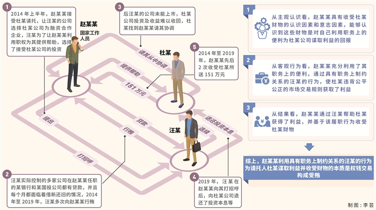 首先,從主觀(guān)認(rèn)識(shí)看,請(qǐng)托人杜某看中的是趙某某手中的職權(quán)能為其公司謀取利益;就汪某而言,其之所以愿意違反公平原則為杜某謀取利益,實(shí)際是懾于趙某某的職權(quán),為的是自己的貸款審批能在趙某某處獲得通過(guò);就受賄人趙某某而言,其主觀(guān)上具有收受杜某財(cái)物的認(rèn)識(shí)因素和意志因素,能夠認(rèn)識(shí)到這些財(cái)物是對(duì)自己利用職務(wù)上的便利為杜某公司謀取利益的回報(bào)。其次,從客觀(guān)行為看,趙某某充分利用了其職務(wù)上的便利,通過(guò)具有職務(wù)上制約關(guān)系的汪某的行為,使杜某違背公平公正的市場(chǎng)交易規(guī)則獲取了利益。最后,從結(jié)果看,趙某某通過(guò)汪某幫助杜某獲得了利益,并基于該履職行為收受杜某財(cái)物。綜上,趙某某利用具有職務(wù)上制約關(guān)系的汪某的行為為請(qǐng)托人杜某謀取利益并收受財(cái)物的本質(zhì)是權(quán)錢(qián)交易,構(gòu)成受賄。