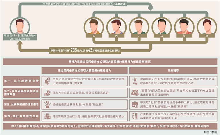綜上,甲利用其擔(dān)任C區(qū)環(huán)保局局長以及C區(qū)科委主任等職務(wù)上的便利,挑選在C區(qū)經(jīng)辦生產(chǎn)型企業(yè)且資金實(shí)力雄厚的商人,明知對(duì)方無資金需求,仍主動(dòng)提出出借錢款并約定高額利率,進(jìn)而獲取高額“利息”,系以“放貸收息”為名的索賄,構(gòu)成受賄罪。