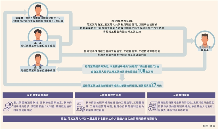 2009年至2024年,范某某與單位時任部分班子成員白某、王某等人共同利用職務(wù)便利,以班子會議形式,將鄭某某名下公司及施工隊(duì)列入市政設(shè)施養(yǎng)護(hù)所工程項(xiàng)目施工作業(yè)名單,將相關(guān)工程業(yè)務(wù)指定鄭某某實(shí)施,部分班子成員在分管的工程監(jiān)管、工程量測算、工程款結(jié)算等方面,利用各自職務(wù)便利分別為鄭某某謀取利益。2009年至2024年,經(jīng)范某某提議并決定,以發(fā)放班子成員“加班費(fèi)”“績效補(bǔ)差款”為由,由班子成員白某等人經(jīng)手,從鄭某某處累計收受現(xiàn)金100余萬元,后經(jīng)范某某決定在部分班子成員內(nèi)部按比例分配,范某某實(shí)得27萬元。