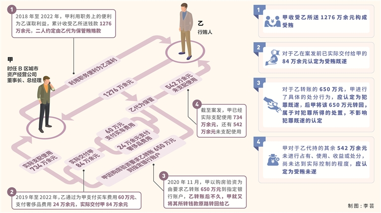 在行賄人代持賄賂款物案件中,受賄人主觀上已具有權(quán)錢交易的故意,但由于形式上賄賂款物未交付,故要全面結(jié)合證據(jù)分析受賄人是否已對財物實現(xiàn)控制,以確保主客觀相一致。本案中,甲利用其作為國有企業(yè)董事長、總經(jīng)理職務上的便利為乙謀取巨額利益,收受乙所送款項1276萬余元,并約定該款項由乙代為保管。至案發(fā)時,乙通過為甲支付買車費用60萬元、支付奢侈品費用24萬余元,已實際交付甲84萬余元,此84萬余元當然為受賄既遂。此外,甲因自身買房驗資需要,數(shù)次安排乙從代其保管的款項中予以提取,2020年11月23日至26日,乙接受甲安排轉(zhuǎn)賬650萬元到其指定賬戶,此時,甲已具有對該650萬元完全的管理權(quán)和支配權(quán),該650萬元應當認定為犯罪既遂,甲雖于2020年11月30日至2020年12月3日陸續(xù)將該650萬元轉(zhuǎn)回匯款賬戶,但這屬于甲對其犯罪所得的自行處置,并不影響其受賄犯罪既遂的認定。此外,甲還以同樣方式,分別讓乙轉(zhuǎn)賬300萬元、200萬元,考慮到這兩次甲調(diào)用金額均未超過此前轉(zhuǎn)回的650萬元,因此,對其受賄既遂數(shù)額不作累計計算。綜上,對甲已經(jīng)實際支配使用的734萬余元應認定為犯罪既遂。